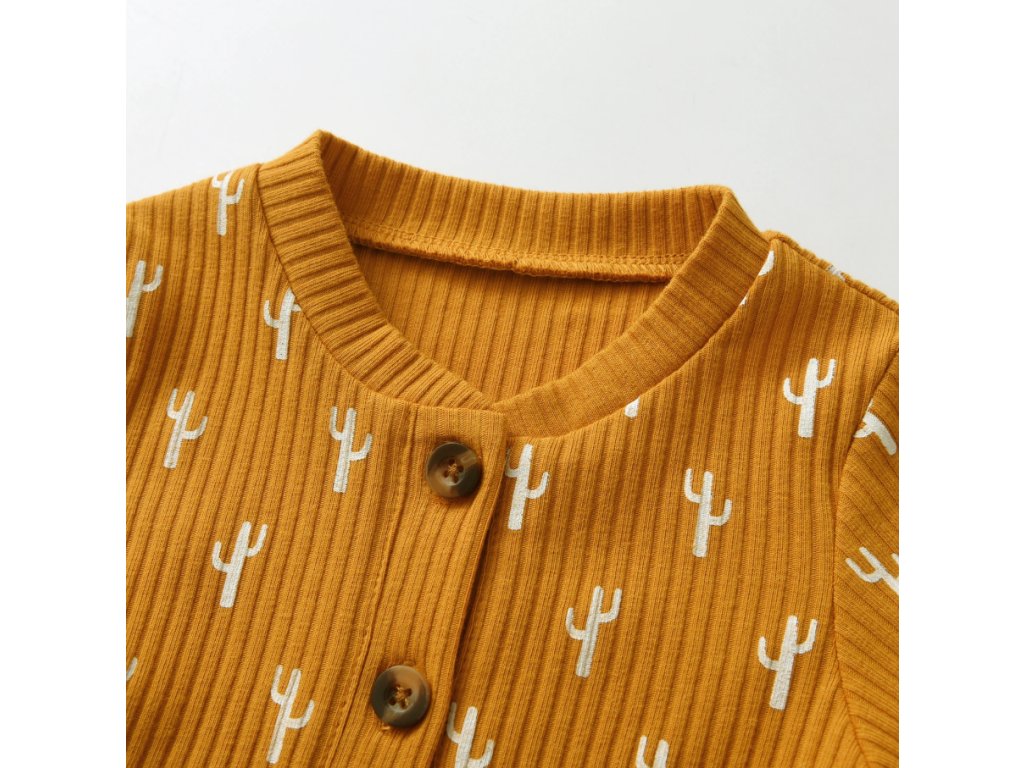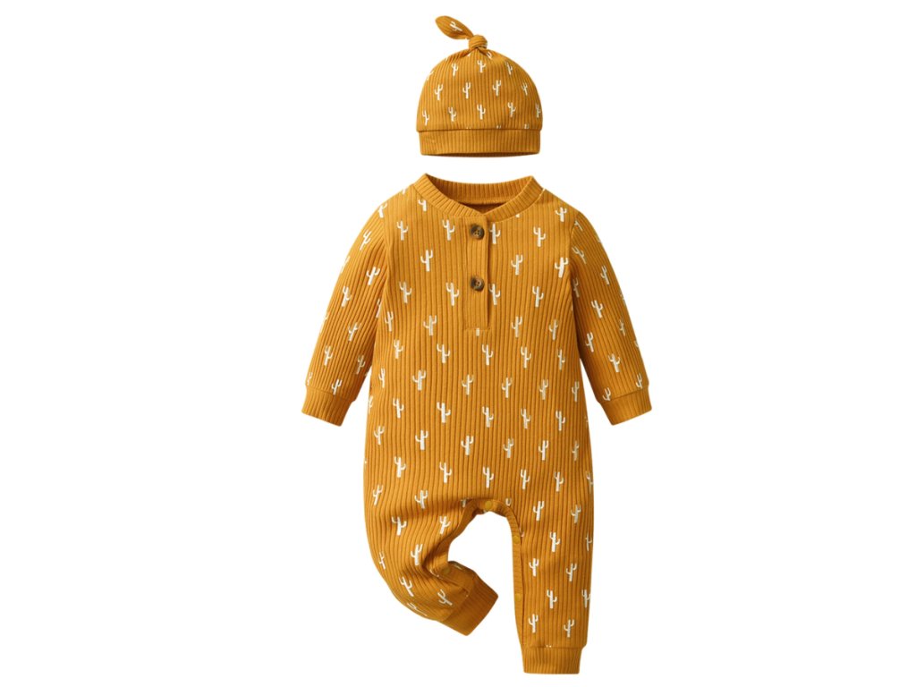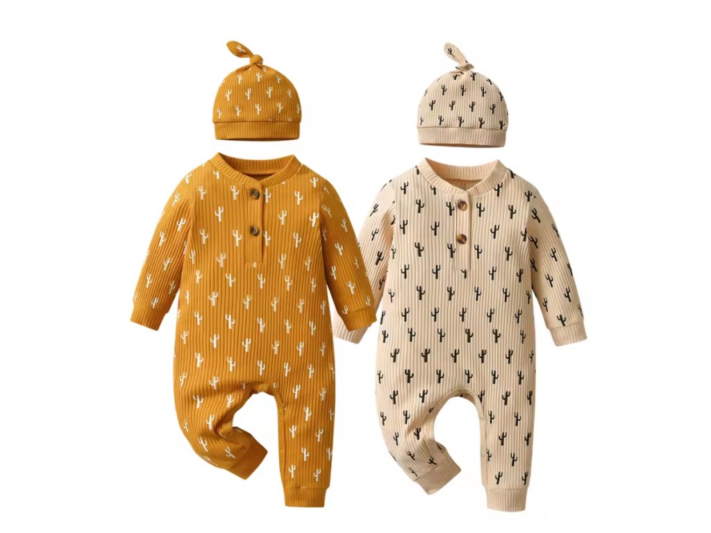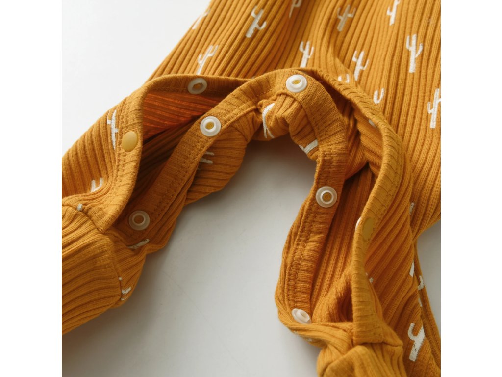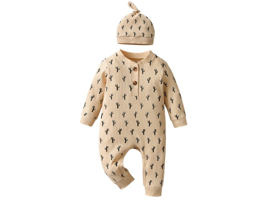 Stylové overaly s jemným motivem kaktusů, ve kterých vaše miminko zažije opravdové pohodlí! Jsou vyrobeny z bavlněné směsi, jsou prodyšné, měkké a příjemné na pokožce – ideální pro jaro a podzim. Praktické zapínání usnadňuje oblékání a přebalování, zatímco sladěná čepička dodává celému outfitu kouzlo. Vhodný jak na spaní, tak na každodenní nošení.