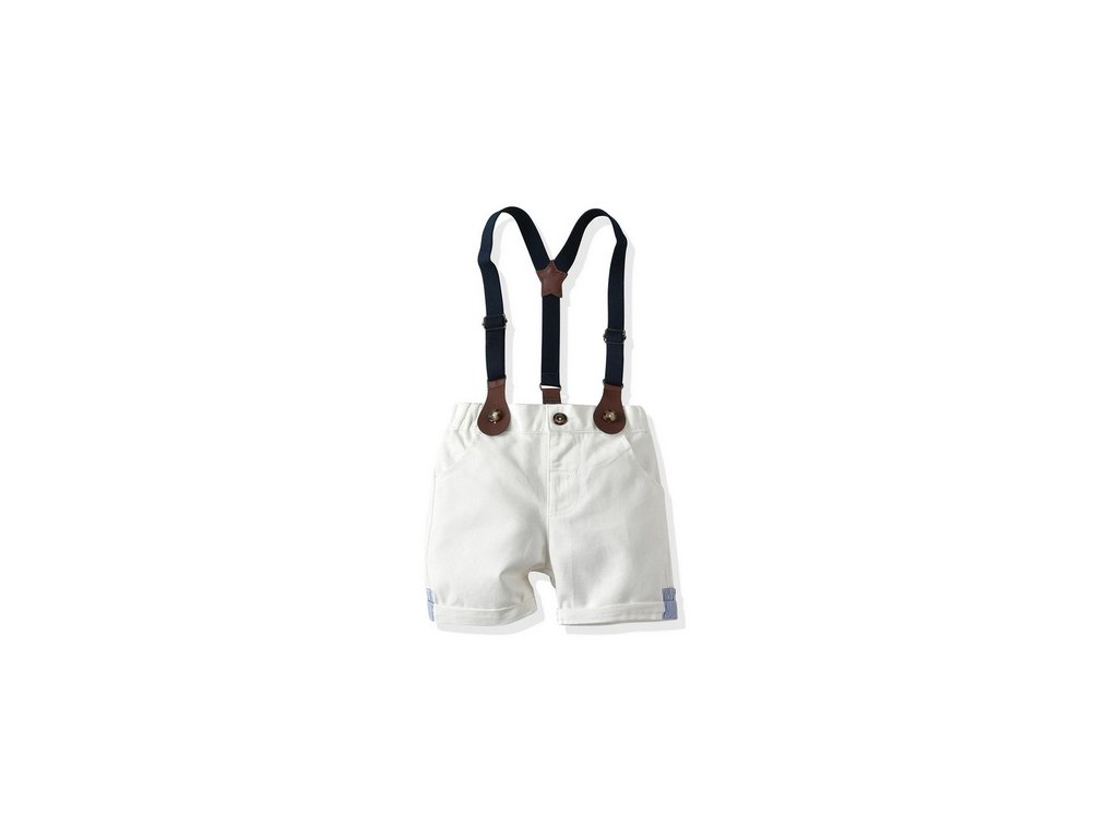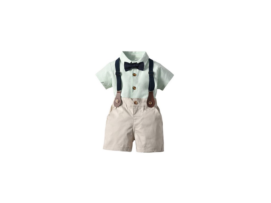 - sada obsahuje béžové kraťasy s kšandami a zelenou pruhovanou košili na knoflíky s motýlkem